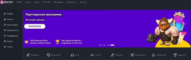 Игровая платформа Selector Casino начала свою работу относительно недавно, но уже получила множество положительных оценок от геймеров. Клиенты отмечают широкий выбор автоматов, ускоренные выплаты, щедрые бонусы и различные поощрения. Игру в Селектор казино можно вести на официальном сайте в десктопе, на мобильных устройствах или через специальное приложение. У гемблеров есть возможность использовать удобные для них способы проведения транзакций. Обязательный процесс верификации в клубе отсутствует.
