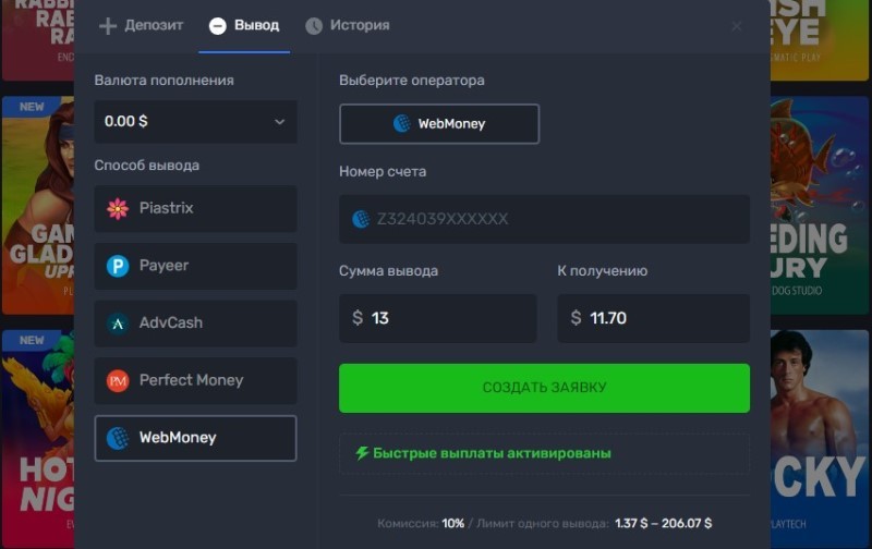 Процедура вывода на криптовалюту не отличается от фиатной валюты. При оформлении заявки игроку нужно выбрать соответствующий метод, указать суму и номер криптокошелька.